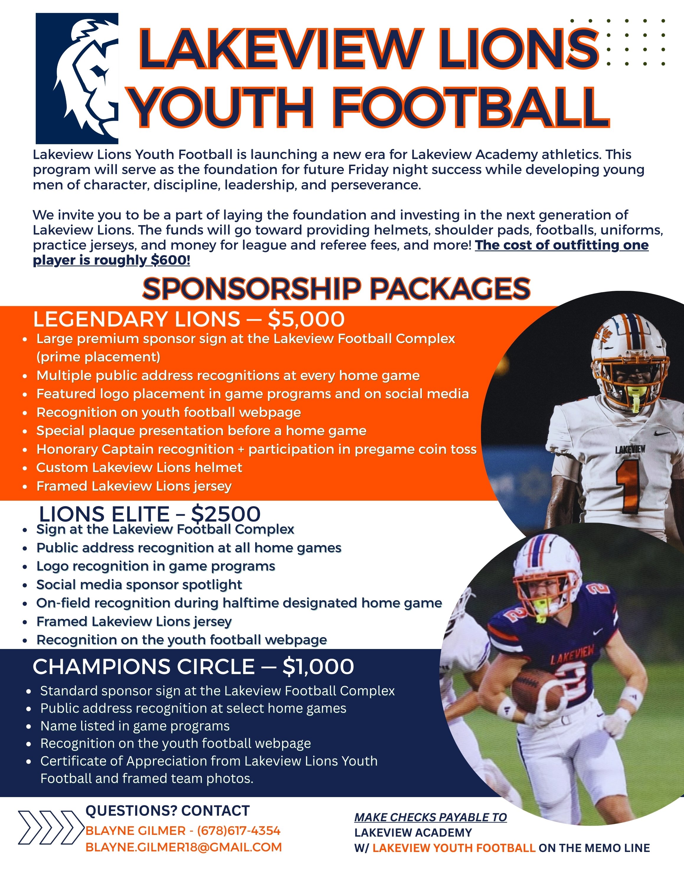 PLEASE SEE OUR CORPORATE SPONSORSHIP PACKAGES BELOW. STARTING A FOOTBALL PROGRAM IS A LARGE UNDERTAKING AND EVERY DONATION MATTERS! IF YOU OR YOUR BUSINESS WOULD LIKE TO CONTRIBUTE, ANY AMOUNT IS WELCOMED. PLEASE MAKE CHECKS PAYABLE TO “LAKEVIEW ACADEMY” WITH “YOUTH FOOTBALL” WRITTEN ON THE FOR/MEMO LINE.